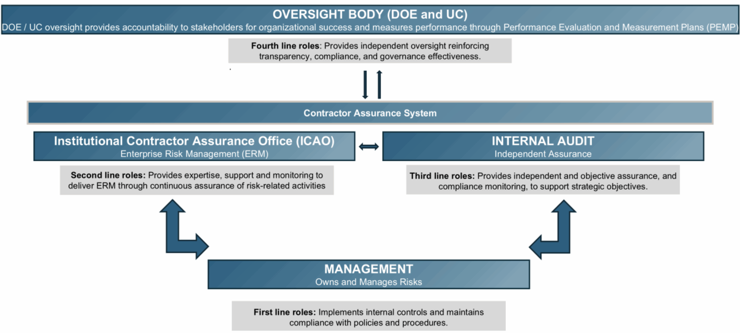 The model shows how risk management and assurance work together. Management forms the first line, owning and managing risks through internal controls. The Institutional Contractor Assurance Office (ICAO)is the second line, providing expertise and monitoring for Enterprise Risk Management. Internal Audit is the third line, delivering independent assurance on controls and governance. Finally, the Oversight Body (DOE and UC) acts as the fourth line, ensuring accountability and transparency through independent oversight.